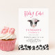 Cartão de convite de aniversário de menina com tema de fazenda bonito, com ilustração aquosa de uma vaca bebê com flor na cabeça. O texto diz "vaca sagrada! XX está virando 1!"