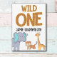 Celebre o primeiro aniversario de estilo do seu filho com este único convite de festas de safari tipográfico único. O design apresenta um grupo de adoráveis animais da selva num design simples e ousado.