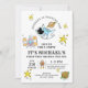 Primeiro convite de aniversário do espaço exterior fofo do astronauta com uma primeira viagem ao redor do tema do sol, apresentando astronauta, planetas, estrelas e equipamentos em aquarela.