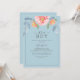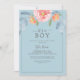 Este primeiro floral floral é um convite para chás de fraldas é perfeito para um chá de fraldas primavera. O design moderno apresenta flores cor de água rosa e laranja sobre um fundo azul claro.