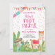 Um primeiro convite de aniversário para a festa de primeiro aniversario da sua menina. Apresentando ilustrações adoráveis de lama e cacto - designs frontais e traseiras incluídos.