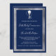 Um moderno, elegante e convite. Um fundo azul marinho decorado com chalice e um hospedeiro, falsos quadros prateados. Personalize e adicione um nome e detalhes. Texto branco.