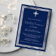 Um moderno, elegante e convite. Um fundo azul marinho decorado com uma cruz, falso armação prateada. Personalize e adicione um nome e detalhes. Texto branco.