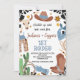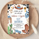 Blue Brown Twin Boys First Rodeo primeiro aniversario Convite para o primeiro primeiro aniversario de rodeio do gêmeo Bonito com algumas botas de cowboy, chapéu de cowboy, algumas cordas, cacto, crachá do xerife e padrão de impressão de vaca negra.
