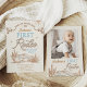Vintage Blue Photo Boys First Rodeo primeiro aniversario Convite estilo vintage de garoto azul e marrom primeiro convite de aniversário rodeado com uma paisagem desértica com cacto, vacas mais compridas, sol e uma corda como o título de texto. O primeiro convite de aniversário de rodeio deste menino também mostra uma foto no verso e é ideal para os meninos da primeira festa de aniversário do oeste selvagem.