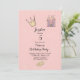 Celebrar um tema rosa e roxo, festa de aniversário princesa com coroa, castelo e calçados bonitinhos. A frente tem algumas estrelas brancas esmaecidas e espirais, e a parte de trás tem listras roxas e cor-de-rosa.