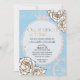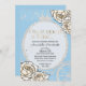 Este elegante convite de festas personalizado apresenta um tema de conto de fadas da Cinderela sobre um fundo de cor azul-bebê. A frase clássica do conto de fadas, "Era uma vez" é impressa em uma fonte dourada acima das informações do evento, dentro a carruagem da princesa reluzente branca. As rosas brancas de vidro manchado aparecem nos cantos superior direito e inferior esquerdo.