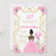 Este convite de aniversário apresenta uma elegante estrutura dourada, uma bela princesa com pele escura e um vestido cor-de-rosa, flores e um balão. Isto é perfeito para uma festa de aniversário.