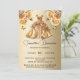 Um belo ouro de fundo falso arma rosas dourados falso e um vestido de baile de conto de fadas com tochas e um corpete apertado. Duas borboletas ouros e pretas são vistas, uma em cada lado do vestido, que parece brilhar na luz. Abaixo do gráfico estão o script de caligrafia em preto e modelos de texto do tipo romano para sua redação personalizada. Se sua filha está celebrando seu aniversário de 15 quinceañera ou se você está hospedando uma chá de panela para ser noiva, esse convite é ideal. Mete a tua filha na ocasião especial dela com este convite luxuoso.