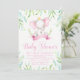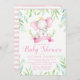 Meninas elefantes fazem convites para bebês com adorável elefante de bebê a aquarela vestindo uma coroa princesa em uma bonito folha de palma e fundo de listras cor-de-água rosa. Estes convites para bebês elefantes são facilmente personalizados para o seu evento simplesmente adicionando os detalhes do seu evento no estilo de letra e na redação que preferir.