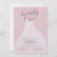 Um convite de festas elegante, na moda, moderno, com um vestido de princesa pintado à mão e cordas de pérolas. Rosa esbranquiçada. Romântico e chique.