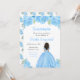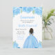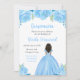 Este convite da Quinceanera apresenta flores florais azuis brilhantes e brilhantes e uma bela princesa com pele escura e um vestido elegante. Isto é perfeito para uma festa de aniversário de Quinceanera.