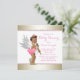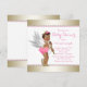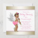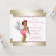 Convite de chá de bebê da princesa Ethnic Angel com adorável bebê negra étnica com roupa de anjo, usando calças com babados rosa, sapatos de salto alto e bela gargantilha de pérolas em um fundo de pérolas rosa e dourado. Este convite de chá de bebê de anjo cor-de-rosa e dourado é facilmente personalizado para o seu evento, adicionando seus detalhes no estilo de letra, cor e fraseado de sua escolha. Você também pode alterar a cor do fundo. Desenho impresso sem pérolas ou laços glitter reais, etc.