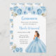 Este convite da Quinceanera apresenta uma bela princesa num vestido de bola azul com arranjos florais. Isto é perfeito para uma festa de aniversário de Quinceanera.