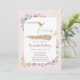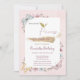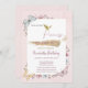 Este primeiro convite de aniversário com borboletas aquáticas e flores em fundo cor-de-rosa.