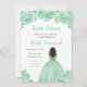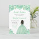 Este doce convite de dezesseis pessoas apresenta flores florais verdes, pouco brilhantes, e uma bela princesa com pele escura e um vestido elegante. Isto é perfeito para uma doce festa de aniversário de dezesseis.