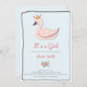 Um belo e moderno convite para chás de fraldas de menina com uma ilustração de um cisne princesa rosa com uma coroa e alguns detalhes florais dentro a branco. A imagem parece estar em três dimensões, mas é apenas um impressão. Ilustrada e projetada por Patricia Alvarez.