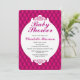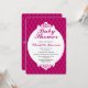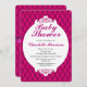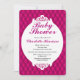 Design de fundo rosa giro e bonito, com um aspecto estofado. Ele também apresenta um crachá rolo de rico branco contendo seus detalhes personalizados do chá de fraldas em cinzas escuras e texto rosa-quente. A parte traseira do convite tem o design de pino de cheio com uma fita rosa púrpura com um gráfico de arco.