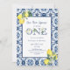 Este primeiro aniversario elegante tem um tema de limão mediterrânico. A borda é um azulejo mediterrânico clássico, azul-aquarela e branco, com limão de aquarela e buquês florais. O texto é caprichoso e clássico ao mesmo tempo.
