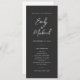 Nosso elegante cartão de casamento fino é perfeito para sua celebração de casamento minimalista. Uma bela fonte branca de caligrafia emparelhada com texto simples e limpo se senta sobre um fundo de cinza escuro macio à frente da placa. O verso branco tem um texto preto tonal que cria um aspecto chic elevado para complementar o seu evento na moda. Fácil e rápido de personalizar-se com seus próprios detalhes de casamento.