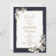 Este lindo design de convite de casamento apresenta um adorável programa de detalhes de casamento floral tropical elegante aquarela branca, azul naval e dourada, convites perfeitos para qualquer cerimônia sofisticada e elegante. Este floral tropical elegante é perfeito para o casal luxuoso e sofisticado. Personalize este design com sua mensagem e informações personalizadas. Todos os desenhos são impressos.