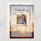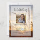Honre seu amado com esta bela celebração do programa de vida/funeral. A frente apresenta um campo pacífico com o sol do pôr, sua foto e detalhes personalizados de sua celebração. (mude a foto de fundo para a sua) Adicione texto personalizado à parte traseira - um obituário, ordem do serviço, poema, obrigado da sua mensagem, etc. Este programa é tão fácil de personalizar - basta clicar em "personalizar este modelo" para alterar o texto e as fotos ou clicar em editar para personalizar ainda mais. Este é, de fato, um programa de um tipo que as pessoas irão apreciar para sempre. Precisa disso em breve? Compre um download Digital do nosso programa funerário e mande-o impresso na sua gráfica local. Muitas lojas oferecem impressão e coleta no mesmo dia.