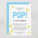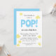 Este convite de chá de fraldas personalizado para um menino apresenta um tema de pipoca giro. Cartoons bonitos de pipoca soam os lados e o fundo do convite. A palavra "POP" é impressa em cor azul-bebê macia para aqueles que esperam um menino. A parte de trás é azul correspondente.