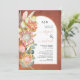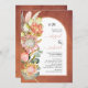 As flores tropicais das proteas pampas, a erva e o eucalichipre, deixam o convite para o casamento do terracotta. Esta adorável design de casamento apresenta um quadro de arco em terracotta com o fundo manchado com as suas iniciais e texto. À esquerda há flores de proteína, gramíneas-pampas e folhas de eucalipto.