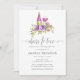 Rosas de púrpura e de pêssego e convites de festas de chá de panela de vinho floral com tipografia elegante.