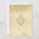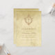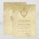 Este convite de confirmação religiosa com um ar vintage tem um brasão floral vintage com uma cruz no centro. O nome do menino é escrito em uma elegante caligrafia. O texto é marrom, assim como o brasão e a cruz. O fundo simula um papel pergaminho antigo.