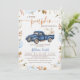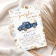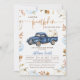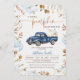 Caminhão Azul Pumpkin Pequeno Chá de fraldas Pumpkin Convite Convite chá de fraldas de bombeiros de outono do Boy apresentando um caminhão azul escuro e abóboras azuis e brancas. Esta design apresenta também algumas linhas divisórias pretas, folhagem castanha de outono e uma rubrica caligráfica moderna. Este convite de chá de fraldas do garoto de carrinho de abóbora é ideal para o chá de fraldas de outono de um garoto.