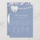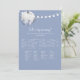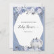Aproveite este elegante jogo floral, floral de outono, menina ou chá de fraldas de menino, Quem é Minha Mamãe? Luzes de cordas na frente com abóbora branca e flores sob abóbora. Flores azuis, roxas e brancas com fundo azul empoeirado. Modelos fornecidas atrás.