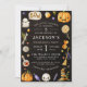 Este convite para o Dia das Bruxas é perfeito para qualquer família que queira enviar os convites para a sua festa de aniversário especial. Este design apresenta um fundo de madeira com elementos bonitos e pintados à mão como uma armação. Dentro do quadro há uma bela tipografia rústica para ir com o tema do Dia das Bruxas. Na parte de trás da design está uma foto do tamanho do cheio da sua abóbora especial.