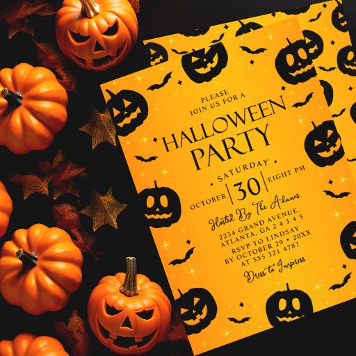 Convide Seus Convidados Para Seus Eventos De Férias Com Estes Convites De Festa Amarelo Do Dia Das Bruxas Laranja Com Abóboras Pretas, Bats & Sparkles Border Frame.
