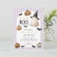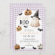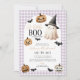 Um pequeno Boo está prestes a chegar! Convite para chás de fraldas temático do Halloween, com abóboras bonitinhas, morcegos e fantasmas em fundo de gingham roxo. O perfeito design de Chá de fraldas do templo halloween!
