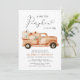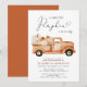 Um convite de chá de fraldas neutro em termos de gênero, que inclui "uma doce abóbora está a caminho", escrito numa mistura de tipografia moderna e um roteiro de na moda com um inchaço cardíaco, aquarelas de um caminhão-oficina de laranja cheio de abóboras e buquês florais e o nome da futura mãe em teracotta. Especificar o sexo do bebê, se desejado (por exemplo, "está a caminho").