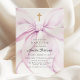 Coquette baptism invitation that features an elegant purple bow and a gold cross.