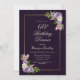 Um convite de festas de aniversário floral roxo, lavanda e cor-de-rosa, 60º janto, com penas roxas e delicadas folhas de samambaia verde.