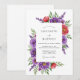 This romantic design features a vibrant arrangement of purple and red watercolor roses. Sprigs of lavender and lush green foliage create a fresh botanical feel against a clean white backdrop. The color palette combines deep violet, soft lavender, and rich crimson for a sophisticated spring or summer look.
