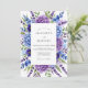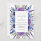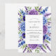 This design features a rich arrangement of watercolor hydrangeas in shades of violet and periwinkle. Delicate sprigs of lavender and lush greenery create a serene botanical aesthetic. The palette of deep purple and cool blue evokes a romantic atmosphere for a seasonal event.