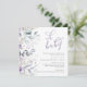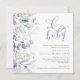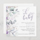 Um convite para chás de fraldas bonito apresenta uma borda de florais de aquarela em tons de roxo com sotaques verdes. Bebê no guião manuscrito. Personalize os principais detalhes, como a mãe, para que seja nome, data e hora do evento, local, RSVP e informações de registro.