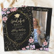 A cute, trendy invitation design featuring a pink and purple summer floral watercolor with gold glitter confetti typography for a graduation party. The design can be personalized with your photo on the back, along with party details.