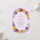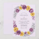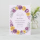 This romantic design features a soft lavender background adorned with a vibrant arrangement of deep purple and golden yellow watercolor roses. Silvery-grey leaf sprigs complement the floral palette, creating a fresh and airy feel. Ideal for a seasonal wedding, the artwork evokes a sense of timeless elegance and botanical beauty.