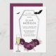 Você vai adorar essas flores roxas e caixões de folha prateada com morcegos pretos assustadores. Vinculando convites para corresponder.