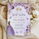 Este adorável convite de aniversário dos Dezesseis apresenta uma borda de flores roxas e marfim em um fundo de aquarela púrpura pálida. Uma tiara dourada, uma menina de cabelo escuro em um vestido princesa roxo e pequenas borboletas roxas decoram o texto. As palavras "Doce Dezesseis" e o nome do convidado de honra aparecem em um guião elegante de escrita manual roxa, com o texto remanescente em cinzas serif.