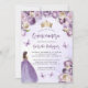 Este adorável convite da quinceañera mostra uma fronteira de flores roxas e marfim em um fundo de aquarela púrpura pálida. Uma tiara dourada, uma menina de cabelo escuro em um vestido princesa roxo e pequenas borboletas roxas decoram o texto. A palavra "Quinceañera" e o nome do convidado de honra aparecem em um guião elegante de escrita manual roxa, com o texto remanescente na fonte serif cinza.