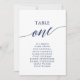 Estes elegantes cartões azuis da mesa número 1 assentos são perfeitos para um casamento simples. A design neutra apresenta uma carta minimalista decorada com tipografia romântica e caprichosa. A placa impressão na frente e atrás (lado duplo).