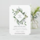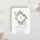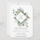 Elegante moldura em forma de diamante botânico aquarela, convite de casamento. Folhas e ramos botânicos verde sage delicados e arejados com flores brancas suaves. Verso do cartão apresenta cor sage poeirento sólida.