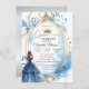Tara de brilho prateado, vestido de princesa azul-aquarela e moldura sobre fundo prateado. Divirta-se na sua festa da quinceañera com este convite elegante. Convide seus convidados para levantar um copo e se unir à diversão com estes convites festivos.