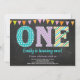 Convite para primeiros aniversarios. Primeira festa de aniversário de aniversário. Rosa, Roxo, Laranja, Amarelo, Verde, Azul, Teal, Aqua. Listras. Fundo Chalkboard. Para mais personalização, clique no botão "Personalizar" e use nossa ferramenta de design para modificar este modelo.